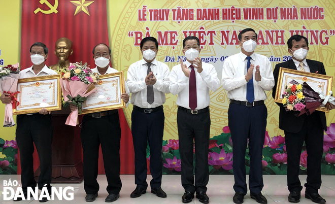 Authorized by the President of Viet Nam, Da Nang Party Committee Secretary Nguyen Van Quang (3rd, right), Party Committee Deputy Secretary Luong Nguyen Minh Triet (4th, right) and People’s Committee Chairman Le Trung Chinh (2nd, right) awarding ‘Heroic Mother’ title to the relatives of the heroic Vietnamese mothers. Photo: NGOC DOAN