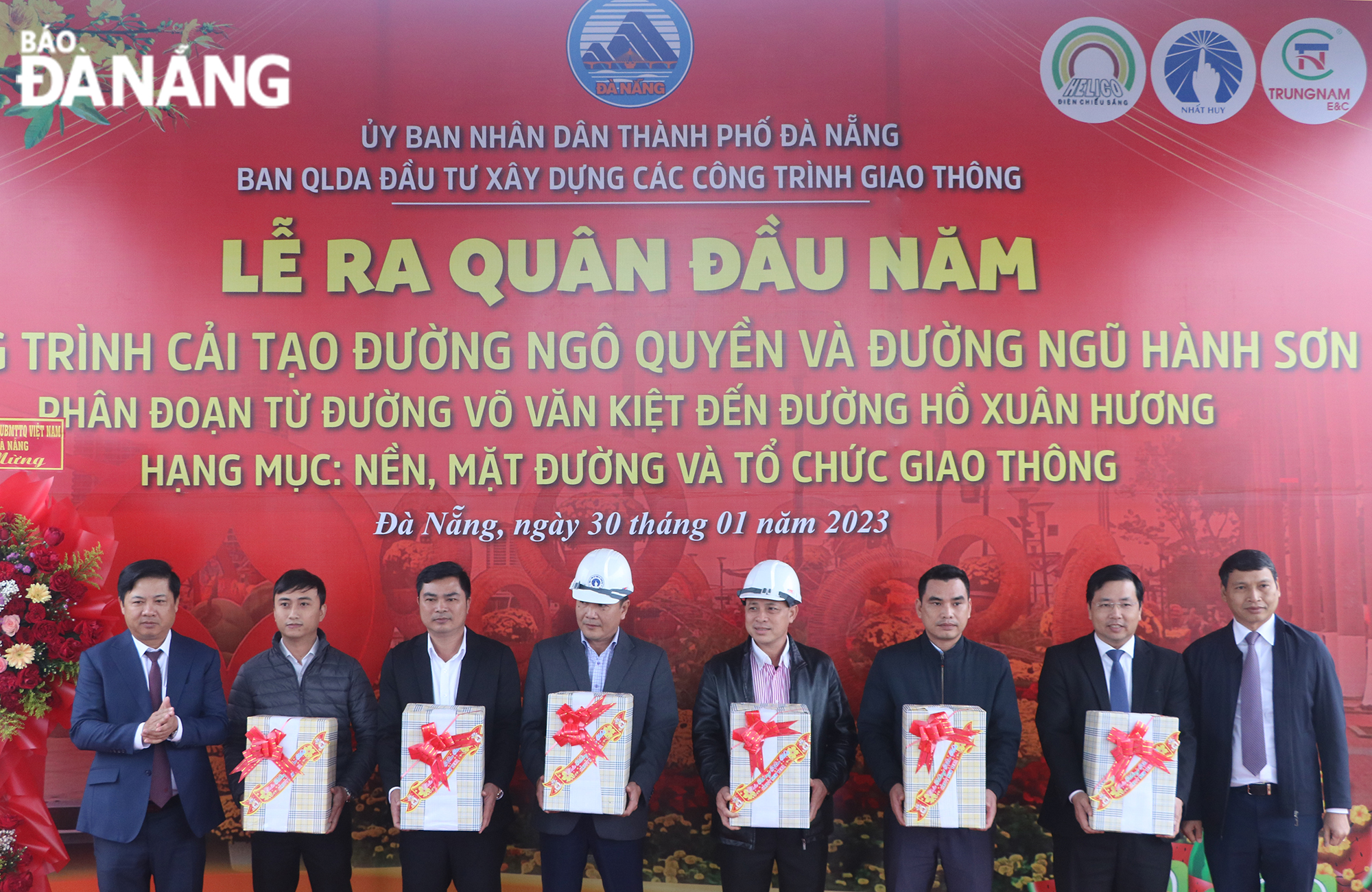 Municipal Party Committee Deputy Secretary cum People’s Council Luong Nguyen Minh Triet (first, left) and Vice Chairman of the local People’s Committee Ho Ky Minh (first, right) present gifts to investors, contractors and construction units of the Ngo Quyen – Ngu Hanh Son route upgrade project. Photo: VAN HOANG