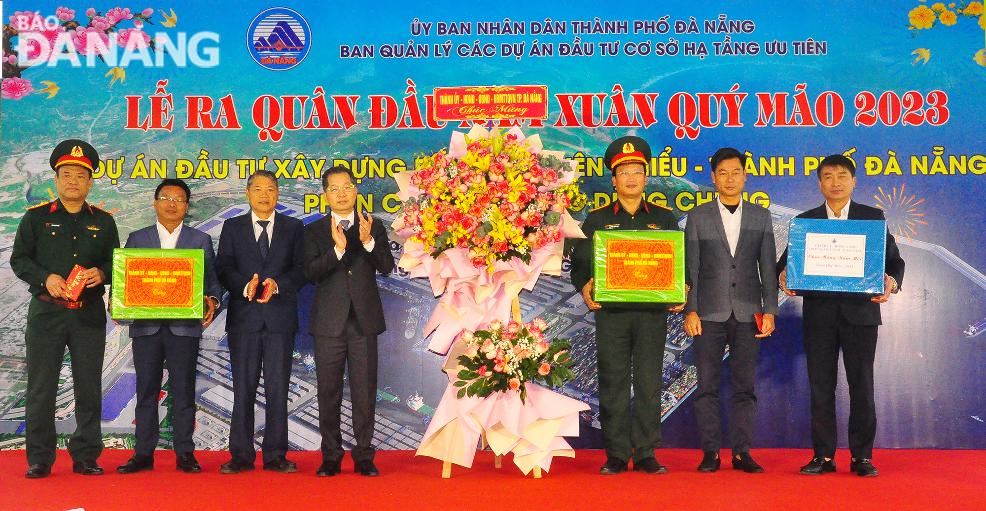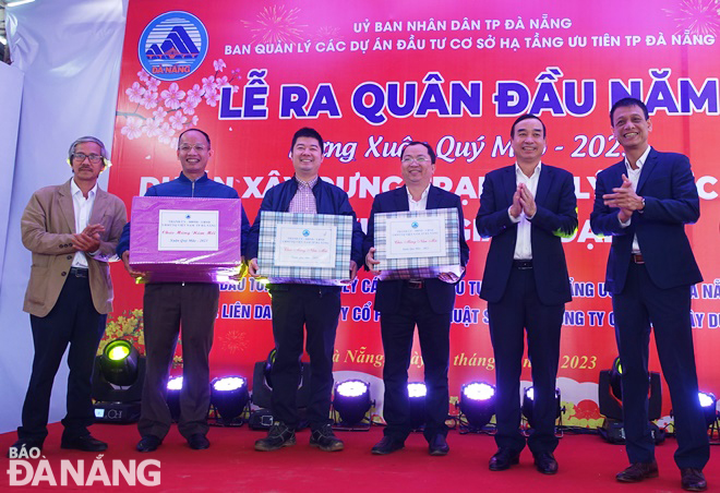 Secretary of the Da Nang Party Committee Nguyen Van Quang (4th, left) presents gifts to construction units and contractors. Photo: THANH LAN