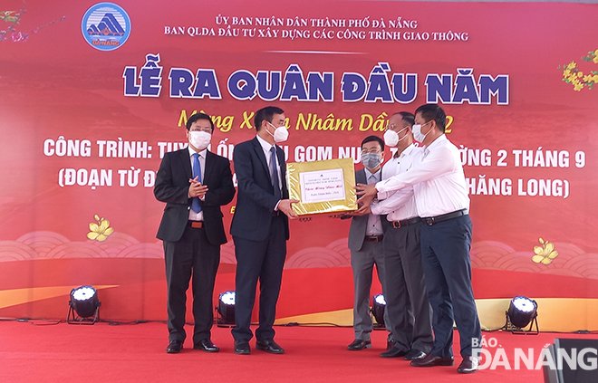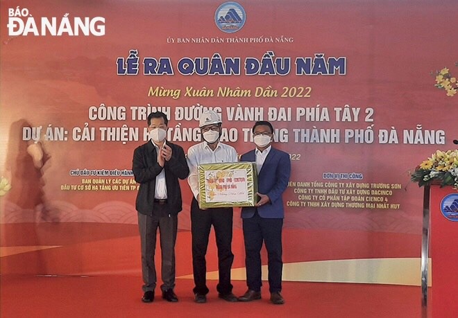 Da Nang People’s Committee Chairman Le Trung Chinh (second, left) presenting a Tet gift construction units