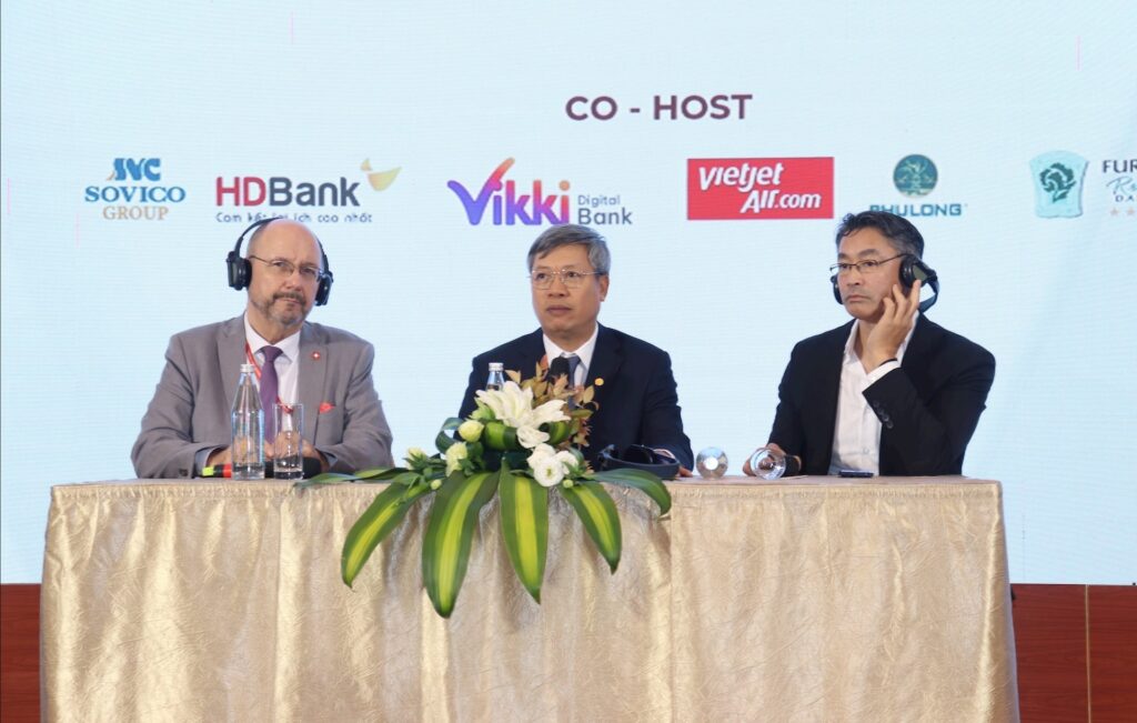 Swiss Ambassador Thomas Gass (first from left), Da Nang Vice Chairman Ho Quang Buu (centre), and SVEF Chairman Philipp Rosler co-chair the press conference.