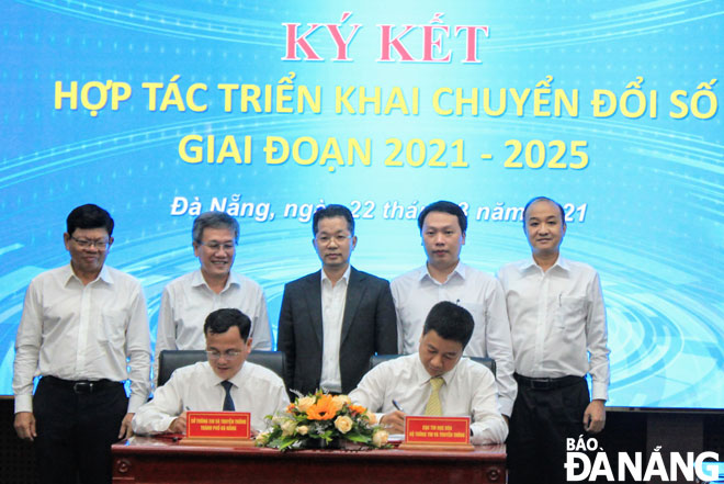 Da Nang Party Secretary Quang (centre) witnessing the signing of a Memorandum of Understanding on digital transformation between the municipal Department of Information and Communications and the Department of Information Technology under the Ministry of Information and Communications