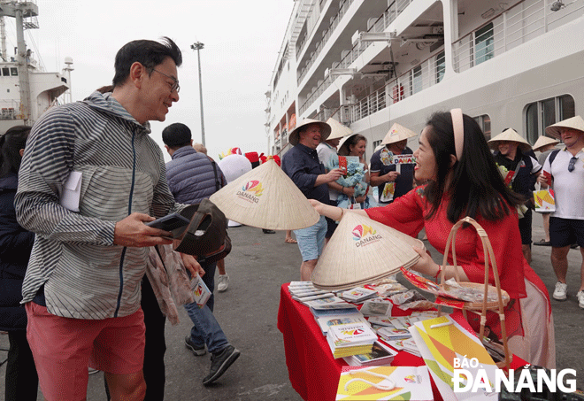 A staff member of the Da Nang Tourism Promotion Centre giving conical hats to international tourist arrivals. Photo: M.Q