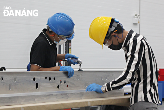 Enterprises have made efforts to protect themselves from the virus spread while ensuring production and business activities. Production activities are observed at the Universal Alloy Corporation Vietnam Co., Ltd in Hoa Lien Commune, Hoa Vang District). Photo: M. QUE