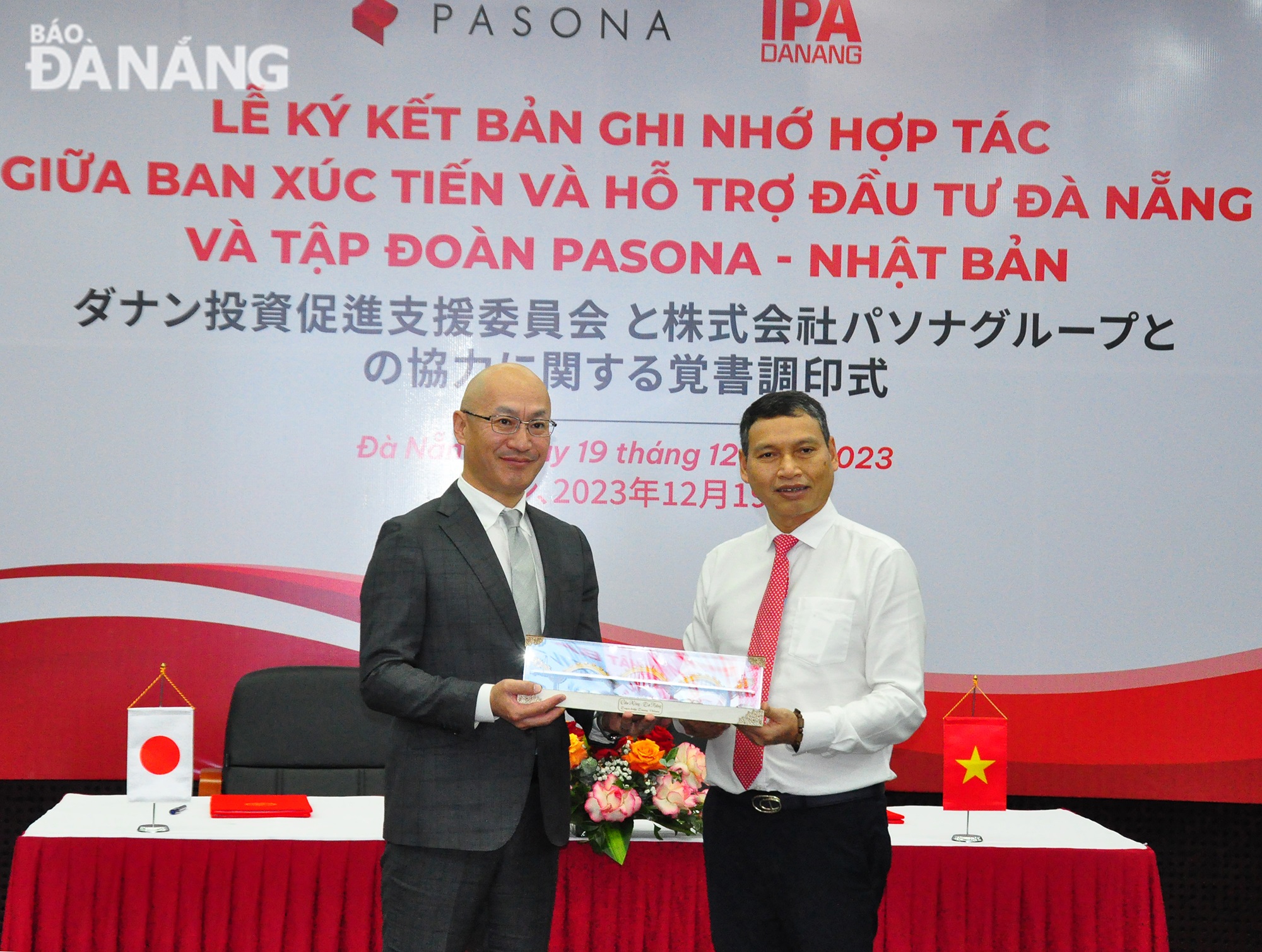 Vice Chairman of the Da Nang People’s Committee Ho Ky Minh (right) presenting a souvenir to leader of the Japanese Pasona Group. Photo: THANH LAN