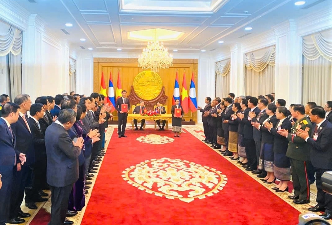 The signing ceremony was witnessed by Vietnamese Party General Secretary To Lam and Party General Secretary and President of Laos Thongloun Sisoulith.