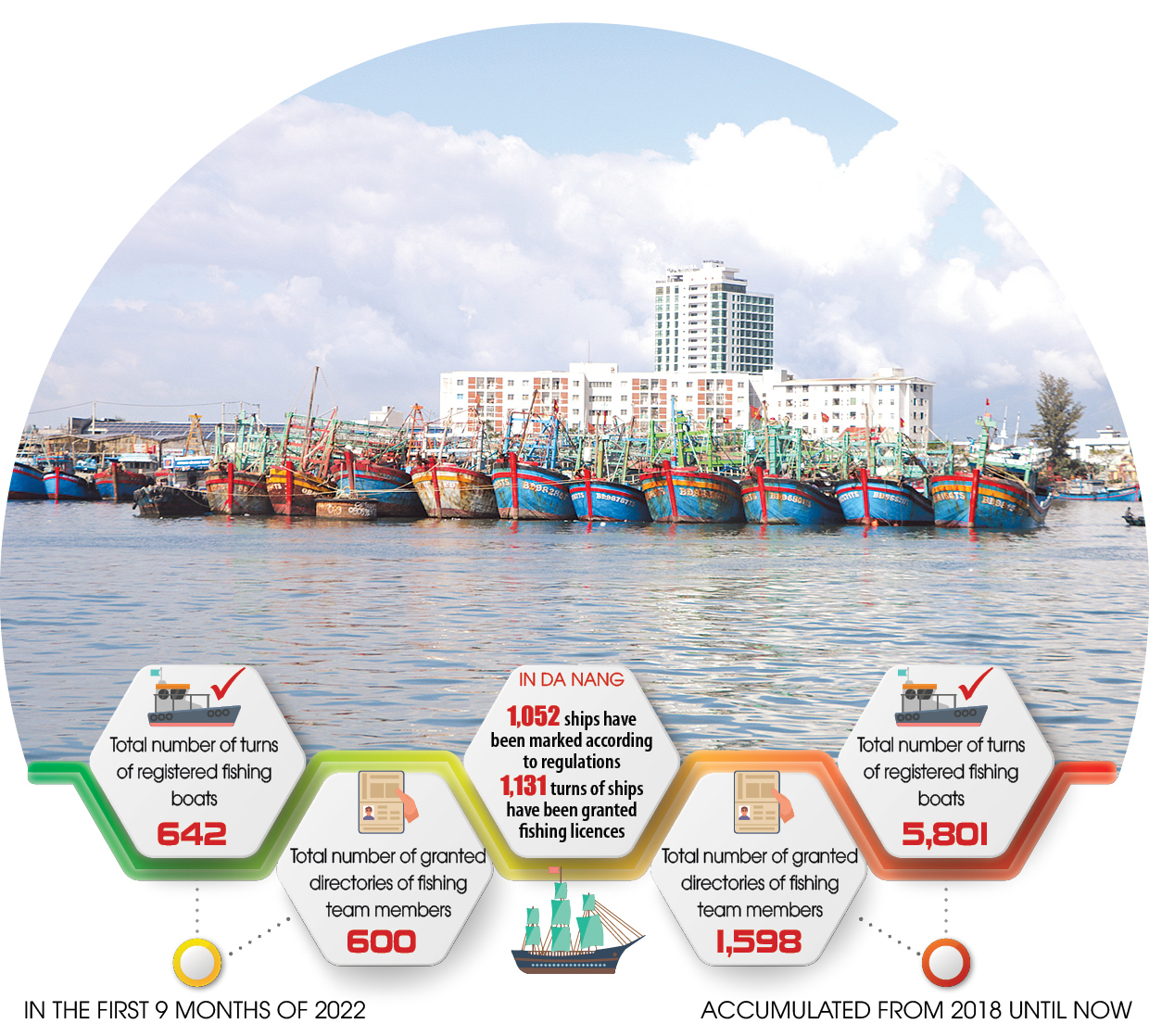In the first 9 months of 2022, 642 turns of fishing vessels were registered, and 600 directories of fishing teamers were granted. Accumulated from 2018 until now, the total number of registered fishing vessels is 5,801, and that of granted directories of fishing team members is 1,598.