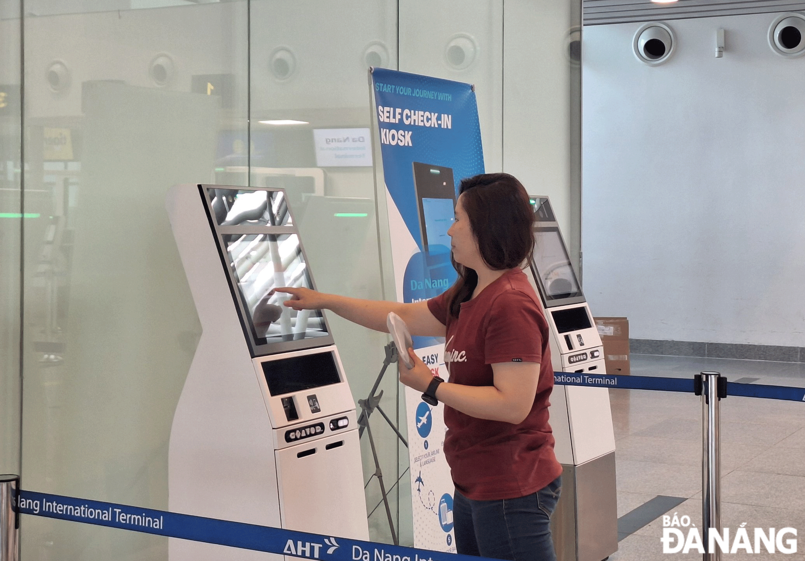 Tourists self-check-in at an automatic kiosk at the Da Nang International Airport. Photo: THU HA