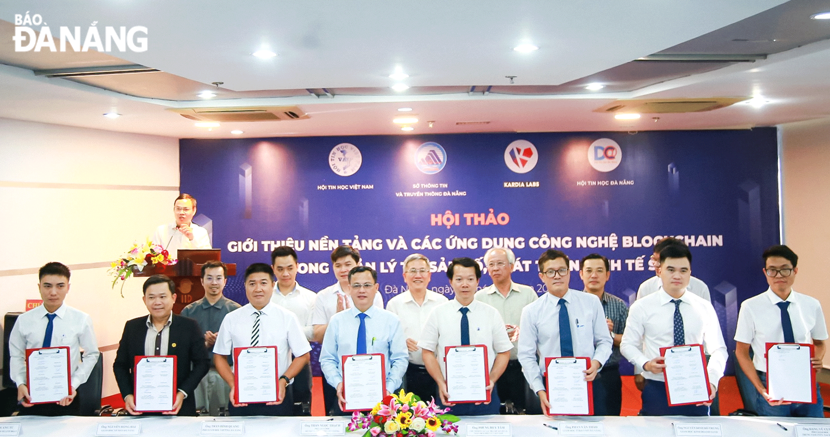 The Da Nang Department of Information and Communications, the Viet Nam Digital Signature and Electronic Transaction Club, and 8 businesses currently providing public digital signature authentication services in the city signed a Memorandum of Understanding on providing free digital signatures for people. Photo: CHIEN THANG