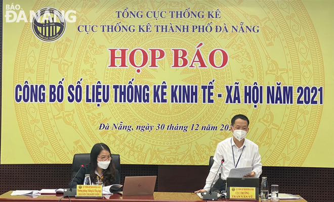 Head of the Da Nang Statistics Bureau Tran Van Vu (right) announcing the city’s socio-economic data in 2021. Photo: M.QUE