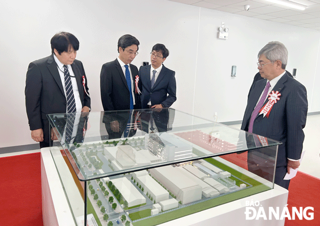, left) and delegates visit the model of building G developed by the Murata Manufacturing Vietnam Co., Ltd. based in the Hoa Khanh Industrial Park, Lien Chieu District. Photo: MAI QUE