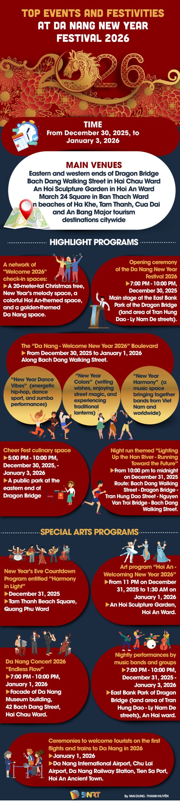 The Da Nang New Year Festival 2026, featuring an extensive series of cultural, artistic, and tourism activities, will take place from December 30, 2025, to January 3, 2026 across the city.
