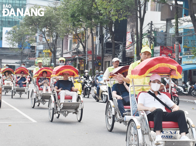Foreign visitors taking a cyclo tour in Da Nang. Photo: THU HA
