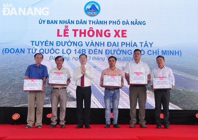 Da Nang Party Committee Secretary Nguyen Van Quang (3rd, left) presenting gifts to representatives of households which have been relocated to hand over the road site to the project’s investor. Photo: THANH LAN