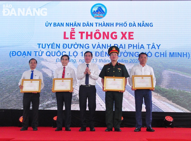 Chairman of the Da Nang People’s Committee Le Trung Chinh (middle) giving Certificate of Merit to units in recognition of their outstanding achievements in construction, supervision, compensation and site clearance work. Photo: THANH LAN