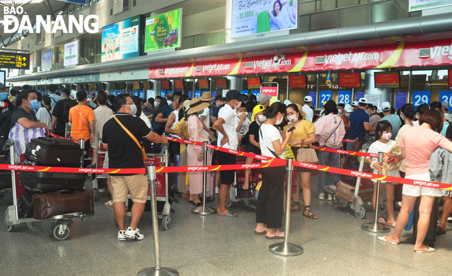 Passengers checking in at a Da Nang airport-based Vietjet counter